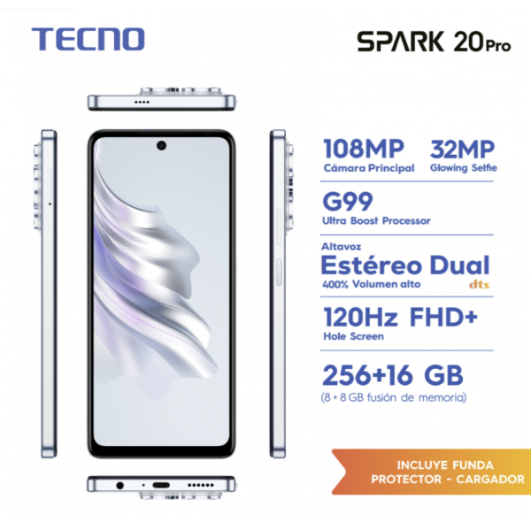 Las capacidades fotográficas del Spark 20 Pro son notables, con una cámara trasera principal de 108 Mpx que captura imágenes claras y detalladas, ideal para fotógrafos aficionados. La cámara frontal de 32 Mpx, equipada con flash, asegura selfies perfectos en cualquier condición de luz. Su conjunto de cuatro cámaras traseras te ofrece versatilidad para capturar momentos únicos desde diferentes ángulos.