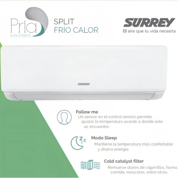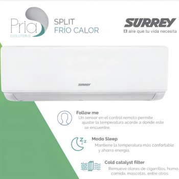 El aire acondicionado Surrey Pría Evolution II modelo 553NFQ09GN81F es la combinación ideal entre eficiencia, confort y tecnología sustentable. Con una capacidad de 2.503 kcal/h para refrigeración y 2.331 kcal/h para calefacción, este equipo split frío/calor brinda un rendimiento óptimo durante todo el año, con bajo consumo y excelente nivel de climatización.