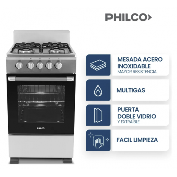 La Cocina Multigas Philco 4 Hornallas Gas PHCN50P en color plata es la elección ideal para quienes buscan funcionalidad y estilo en su cocina. Con cuatro hornallas de gas, este modelo permite una cocción eficiente y rápida, adaptándose a las necesidades de cualquier hogar. Su diseño de pie y su acabado en plata aportan un toque moderno y elegante, convirtiéndola en un elemento destacado de tu cocina. El horno cuenta con un visor que facilita el control de la cocción, mientras que las válvulas de seguridad garantizan un uso seguro. Con una profundidad de 50 cm, se adapta perfectamente a espacios reducidos sin sacrificar la capacidad de cocción. Con un peso de 22.6Kg y dimensiones adecuadas para un fácil manejo, esta cocina es práctica y funcional. Su diseño es acompañado por materiales de primera calidad como mesada de acero inoxidable, puerta de doble vidrio en el horno y extraíble, de fácil limpieza, además de contar rejillas reforzadas. La Cocina Philco PHCN50P es la opción perfecta para quienes valoran la calidad y el rendimiento en sus electrodomésticos