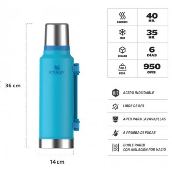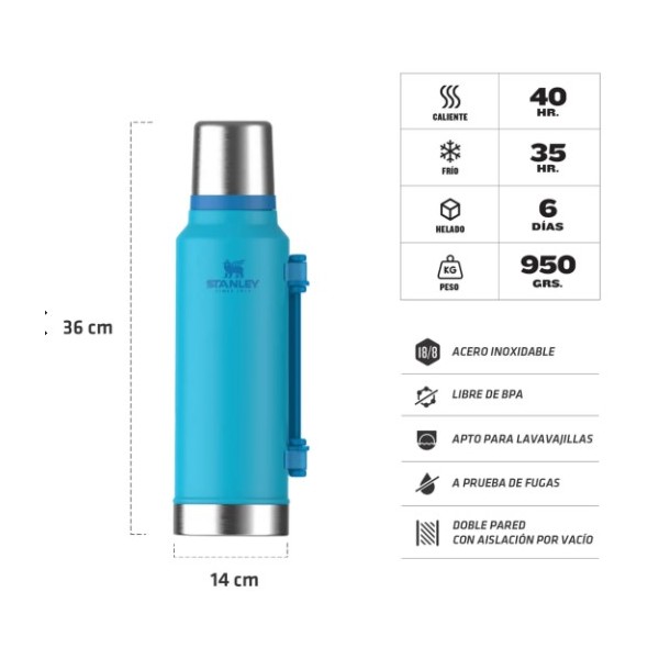 La palabra que viene a la mente es "icónico": diseño elegante, construcción robusta y una actitud indescriptible. Totalmente a prueba de fugas y capaz de mantener las bebidas calientes durante 40 horas, frías durante 45 horas o con hielo durante 6 días. Con el termo Stanley nunca tendrás que preocuparte de que el agua se enfríe o que tu bebida se caliente. Gracias a su pared externa de acero grueso obtendrás un rendimiento térmico que te durará a través de los años.