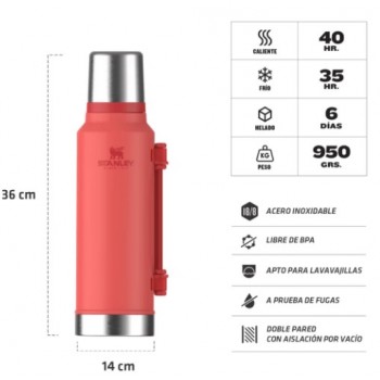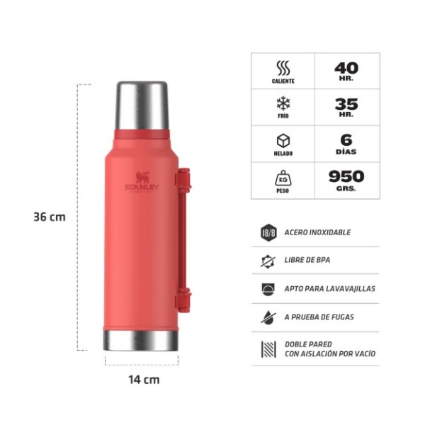 La palabra que viene a la mente es "icónico": diseño elegante, construcción robusta y una actitud indescriptible. Totalmente a prueba de fugas y capaz de mantener las bebidas calientes durante 40 horas, frías durante 45 horas o con hielo durante 6 días. Con el termo Stanley nunca tendrás que preocuparte de que el agua se enfríe o que tu bebida se caliente. Gracias a su pared externa de acero grueso obtendrás un rendimiento térmico que te durará a través de los años.