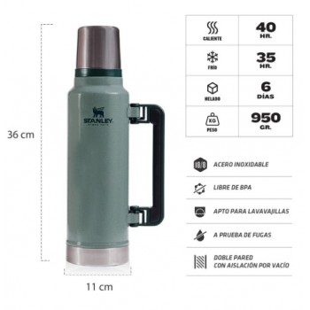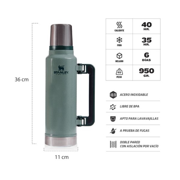 La palabra que viene a la mente es "icónico": diseño elegante, construcción robusta y una actitud indescriptible. Totalmente a prueba de fugas y capaz de mantener las bebidas calientes durante 40 horas, frías durante 45 horas o con hielo durante 6 días. Con el termo Stanley nunca tendrás que preocuparte de que el agua se enfríe o que tu bebida se caliente. Gracias a su pared externa de acero grueso obtendrás un rendimiento térmico que te durará a través de los años.