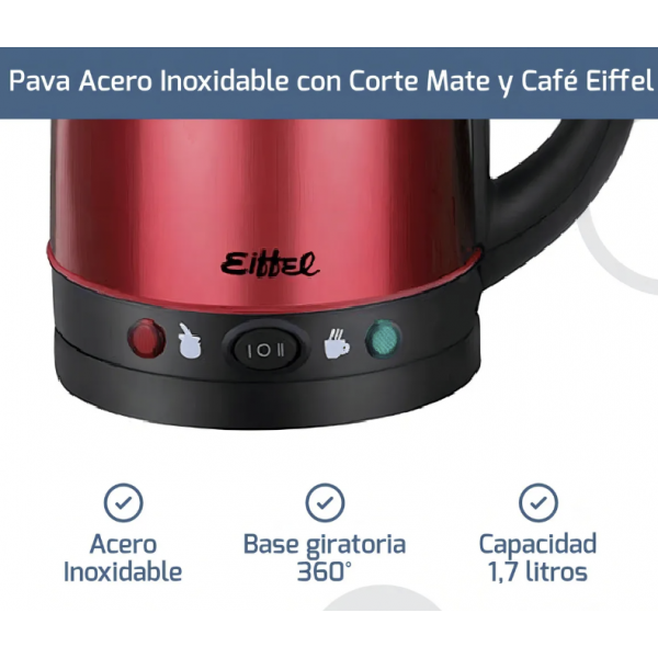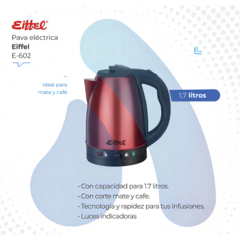 La Pava Eléctrica Eiffel E-602 es la solución perfecta para quienes buscan rapidez y eficiencia en la preparación de infusiones. Con una capacidad generosa de 1.7 litros, es ideal para compartir momentos especiales con amigos y familiares. Su elegante diseño en color rojo con corte mate y café no solo aporta un toque moderno a tu cocina, sino que también es funcional. Esta pava cuenta con un sistema de corte automático que garantiza seguridad al evitar el sobrecalentamiento. Aunque no incluye pantalla digital ni control de temperatura, su simplicidad la hace fácil de usar. Además, su función mate permite disfrutar de una experiencia única al preparar tus infusiones favoritas. Con la Pava Eléctrica Eiffel, cada taza será un deleite.