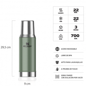 Conquista la naturaleza con nuestro clásico termo Stanley en verde, un símbolo de vitalidad y aventura. Su resistencia te acompaña en todas tus expediciones, asegurando que tus bebidas siempre estén listas para disfrutar.