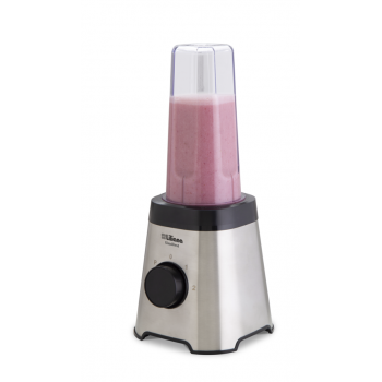 · Cuchilla de acero inoxidable, removible para fácil limpieza y apta para picar hielo. · 2 velocidades + función turbo. · Enrollacable. · Base antideslizante. · Jarra de vidrio con tapa para agregar ingredientes en funcionamiento. · Botella portable con tapa hermética y pico deportivo. · Cuerpo de acero inoxidable. · Potencia: 600 watts.